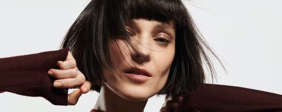 Symmetrische Wellen im Ponybereich und die nach innen gedrehte Form transformieren den Bob vom Tag in den Abend. Mit kühnem Schwung imitiert der Eyeliner die Bewegung der Haare und umrahmt den Blick in mystischem Blau.